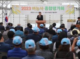 당진시농업기술센터는 21일 정미면 대운산리에 위치한 벼 신기술 평가단지에서 ‘벼농사 종합평가회’를 개최했다. 평가회는 오성환 당진시장을 비롯한 농업인 및 관계자 등 150여 명이 참석한 가운데 올해 벼농사를 평가·분석했다