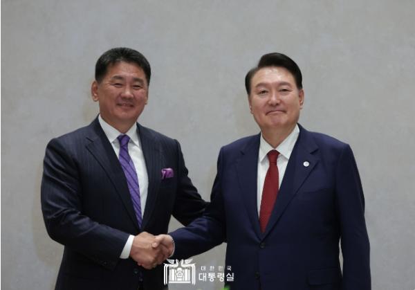 제78차 유엔총회 고위급 회기 참석을 위해 미국 뉴욕을 방문 중인 윤석열 대통령은 9월 21일 오후 '오흐나 후렐수흐(Ukhnaa Khurelsukh)' 몽골 대통령과 정상회담을 가졌다.
