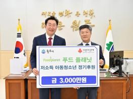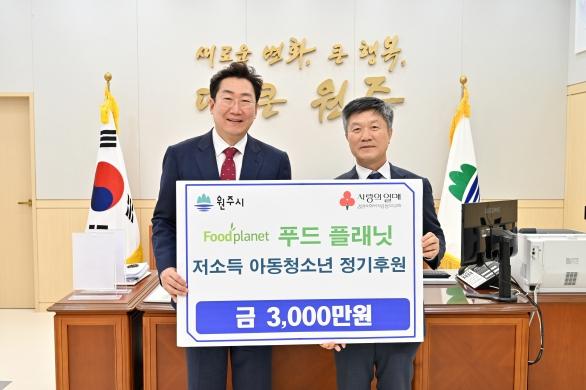 ㈜푸드플래닛은 21일 시청 시장 집무실에서 원주시 저소득 아동·청소년을 위한 정기 후원금 3,000만 원을 전달했다.