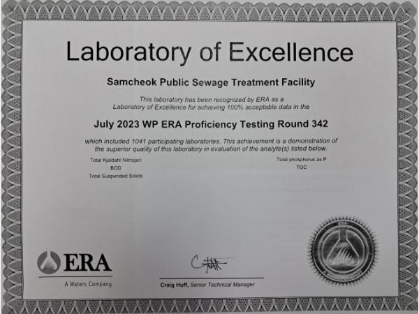 삼척시 공공하수처리시설(관리대행사 (주)동명기술공단)이 최근 미국 환경자원협회(ERA)가 주관한 국제숙련도 평가에서 수질 분야 시험?분석 ‘우수기관(Laboratory of Excellence)’으로 인증받았다.