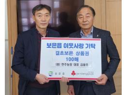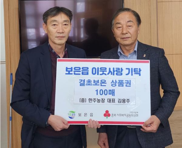 보은군 보은읍 강신1리 소재 한주농장을 운영하는 김응주 대표는 지난 21일 보은읍 행정복지센터를 방문해 민족 고유의 명절 추석을 앞두고 어려운 이웃에게 전달해 달라며 결초보은상품권 1만원권 100매(100만원 상당)를 기탁했다.