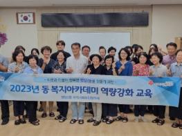 동복지아카데미는 지역 주민 복지역량 강화 교육으로 주민이 우리동네 전반적인 사항을 이해하고 여러 가지 문제점을 파악하여 그에 맞는 해결 방안을 마련할 수 있는 능력을 강화하는 교육과정이다.