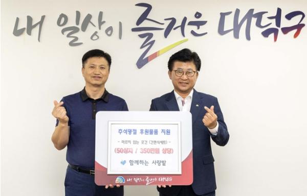 대전 대덕구는 22일 함께하는 사랑밭(NGO 단체)으로부터 추석 명절을 맞아 소외계층을 위해 간편식 세트 50상자(350만원 상당)를 기탁받았다고 밝혔다.