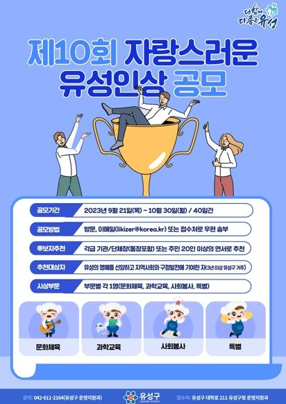 대전 유성구는 9월 21일부터 10월 30일까지 ‘제10회 자랑스러운 유성인상’의 후보자를 공모한다고 밝혔다.