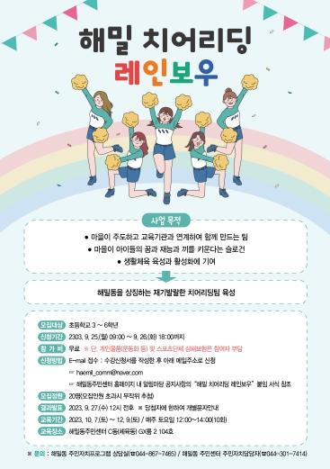 세종특별자치시 해밀동 주민자치회가 해밀동을 응원하고 상징하는 마스코트 팀으로 ‘해밀 치어리딩 레인보우’ 팀을 육성하기로 하고 25일부터 26일까지 이틀간 팀원을 모집한다.