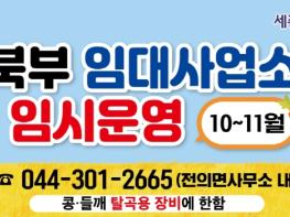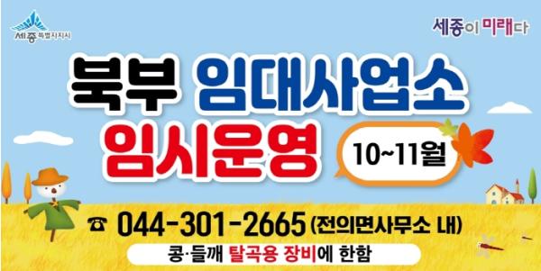 세종특별자치시 농업기술센터가 세종시 북부지역 농업인들의 농기계 임대 장비 이용 편의를 제고하기 위해 전의면사무소 내 북부 농기계 임대사업소를 임시로 설치하고 10월부터 11월까지 2달간 운영에 나선다.