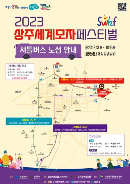 상주시는 오는 10월 13일부터 15일까지 개최되는 2023 상주세계모자페스티벌 기간 동안의 방문객 편의를 위해 무료 순환(셔틀)버스 운행 등의 교통편의 대책을 마련한다.