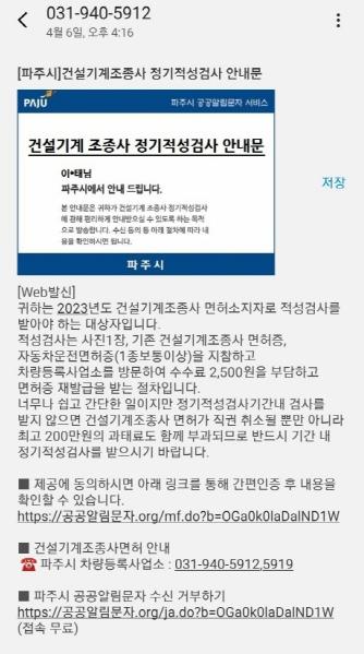 파주시는 건설기계 조종사면허 적성검사 대상자에게 검사 기간 내에 적성검사를 받을 것을 당부하는 공공알림문자를 오는 26일에 발송한다고 밝혔다.