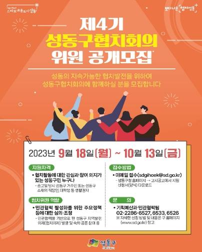 서울 성동구가 오는 10월 13일까지 총 26일간 지속가능한 민관협치 정책의 비전을 제시하고 함께 실현해 나갈 제4기 성동구협치회의 민간위원을 공개모집한다.