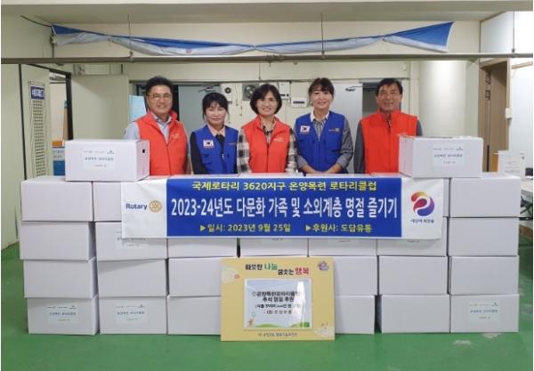 온양목련 로타리클럽이 지난 25일 추석 명절을 맞아 아산시 온양2동 행복키움추진단에 식품 꾸러미 30개(240만 원 상당)를 후원했다.
