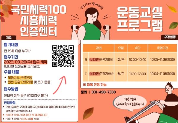 시흥시가 운영하는 국민체력100 시흥체력인증센터에서 ‘2023년 비대면 근력 강화 운동교실’에 함께할 시민을 9월 20일부터 모집한다.