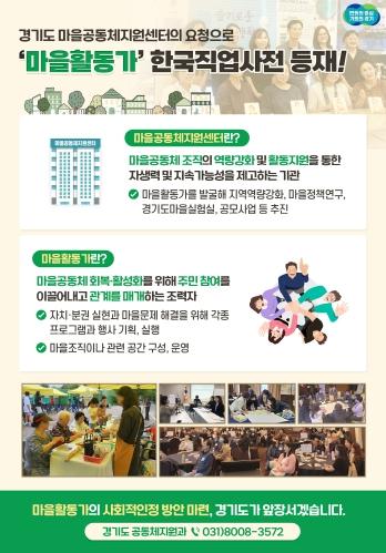 앞서 경기도 마을공동체지원센터는 마을활동가의 직업 인정 등 사회적 인정 방안을 마련하기 위해 연차별 연구와 전문가 자문, 공론장을 지속적으로 개최했으며, 현장 마을활동가들의 의견을 수렴해 지난해 10월 직업사전 등재를 건의했다.