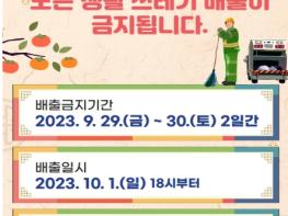 생활쓰레기 배출 금지 기간은 9월 29일부터 30일까지 2일간이다. 연휴 기간 중 배출하지 못한 쓰레기는 10월 1일(일) 18시부터 배출하면 된다.