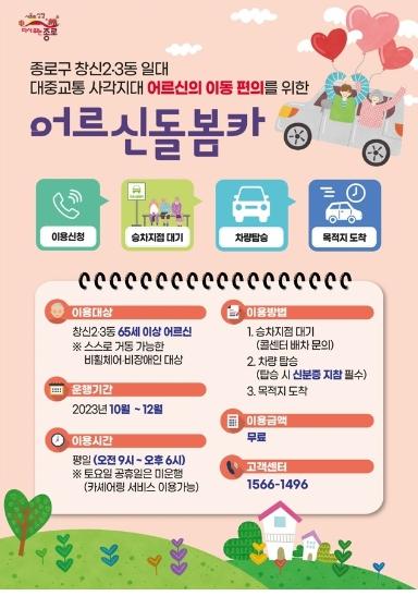 어르신돌봄카 이용 대상은 스스로 거동할 수 있는 창신 2·3동 거주 65세 이상 주민이다.