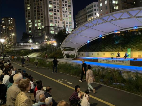 오후 7시 야외무대에서 감미로운 선율이 흐르자 맞은편 벤치를 중심으로 주민 100여명이 모여들었다.