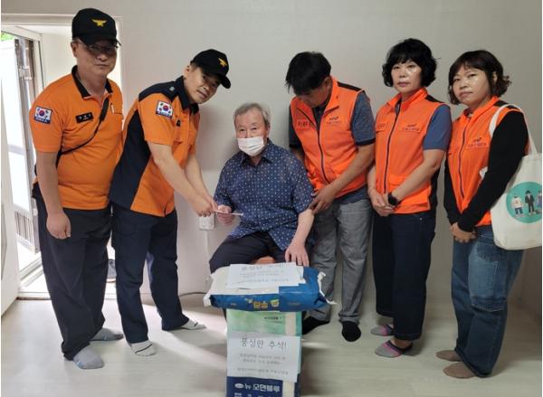 북구 화명2동 행정복지센터는 지난 25일 북부소방서 화명119안전센터 및 의용소방대 화명지역에서 추석 명절을 앞두고 관내 취약계층 2가구를 방문하여 이웃돕기 성품으로 백미 10kg, 휴지 1팩, 성금 10만원을 각각 전달했다고 밝혔다.