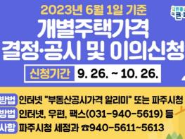 파주시는 2023년 6월 1일 기준 개별주택(단독, 다가구, 다중, 주상용) 가격을 9월 26일 결정·공시하고 10월 26일까지 주택소유자나 이해관계인 등의 이의신청을 받는다고 밝혔다.