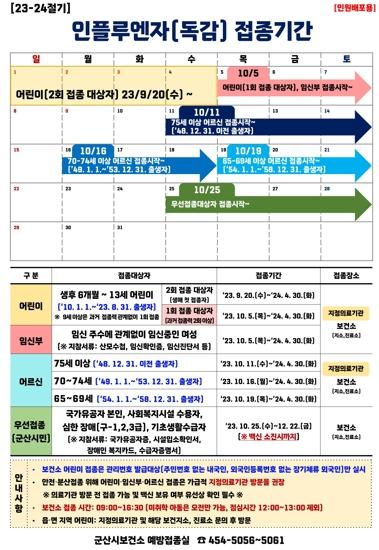 보건소 관계자는 “2023-2024절기 인플루엔자 유행주의보가 발령된 만큼 인플루엔자 예방접종이 더욱 중요하다”며 “시민의 건강보호를 위해 접종대상별 사업기간을 준수해 인플루엔자 예방접종을 반드시 받아달라”고 당부했다.
