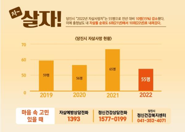 통계청의 사망 원인통계에 따르면, 당진시의 자살사망자 수는 2021년 65명에서 2022년 55명으로 줄었다. 충남 15개 시군 내 자살률 순위도 전년 6위에서 10위로 떨어졌다.