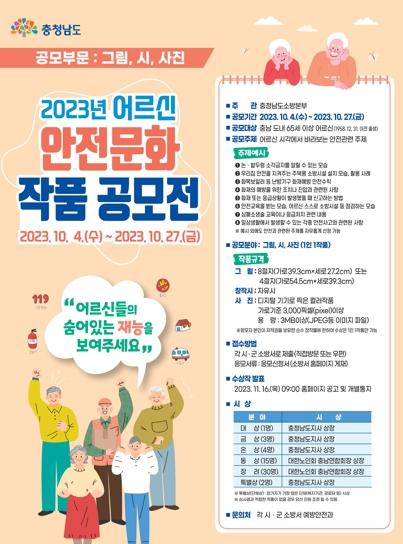 이번 공모전은 충남 도내 65세 이상 어르신(1958.12.31. 이전 출생)이라면 누구나 참여할 수 있으며 총 3개 분야(그림, 창작시, 사진)에 1인 1작품 공모가 가능하다.