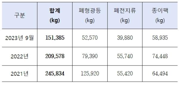 제주시는 올해 9월기준 생산자책임(EPR)제도 품목인 폐형광등 52.6톤(약 26만 개), 폐전지류 39.9톤(약 17만 개), 종이팩 58.9톤(일반팩51.9톤, 멸균팩 7톤)을 수집해 재활용 처리했다.