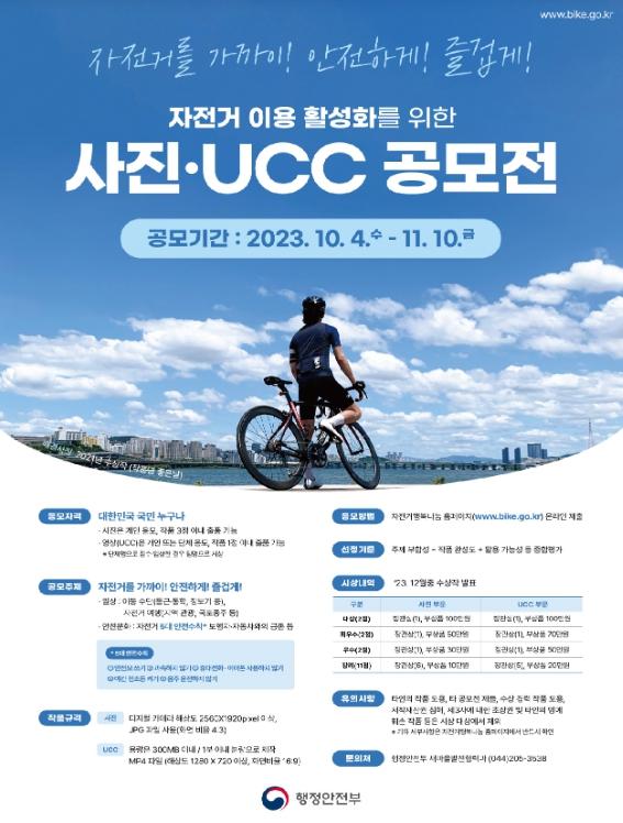 행정안전부는 ‘자전거를 가까이! 안전하게! 즐겁게!’를 주제로 10월 4일부터 11월 10일까지 자전거 이용 활성화를 위한 사진·영상(UCC) 공모전을 개최한다고 밝혔다.