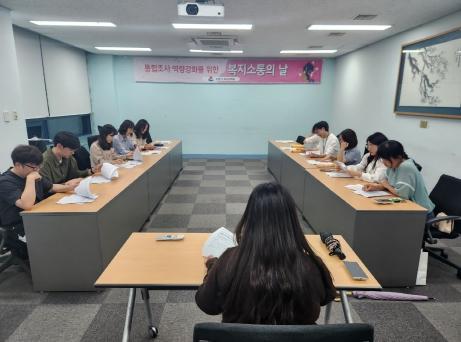 ‘복지소통의 날’은 통합조사 직원들이 조사관리팀 내부 강사를 선정하여 교육 회차별 다양한 주제의 자료 연구를 통한 교육을 자체적으로 실시하고, 다양한 복지서비스 사례공유와 더불어 공정하고 표준화된 기준 마련으로 업무 역량을 강화하기 위해 실시하고 있다.