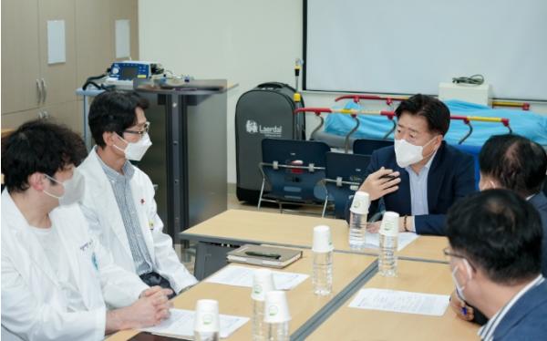 오영훈 지사는 2일 오후 제주대학교병원 응급실과 제주원광재가노인복지센터를 잇달아 방문해 응급환자와 어르신, 의료·복지종사자들과 소통하는 시간을 가졌다.