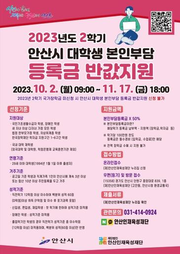안산시는 10월 2일부터 11월 17일까지 올해 2학기 안산시 대학생 본인부담 등록금 반값 지원 신청을 받는다고 30일 밝혔다.
