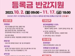 지원금은 등록금 중 장학금 등을 제외한 나머지 본인부담금의 50%, 학기당 최대 100만원까지며, 지원 요건 충족 여부를 확인한 뒤 오는 12월 29일 일괄 지급할 예정이다.