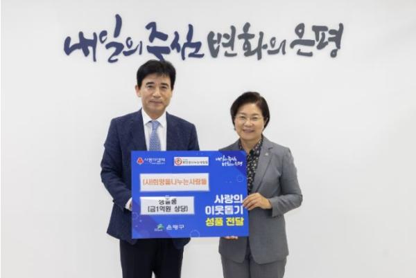 은평구는 지난달 21일 (사)희망을나누는사람들과 사랑의 이웃돕기 성품 전달식을 가졌다고 밝혔다.