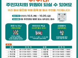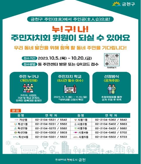 금천구는 지역사회 발전과 마을 민주주의 실현에 함께할‘제4기 금천형 주민자치회 위원’을 10월 5일부터 10월 20일까지 15일간 모집한다고 밝혔다.