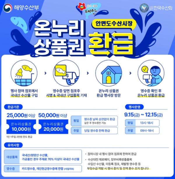 군은 오는 12월 15일까지 안면도수산시장에서 국내산 수산물을 구매한 고객에게 당일 구매금액의 최대 40%를 온누리상품권으로 환급해주기로 하고 지난달부터 운영에 돌입했다고 밝혔다.