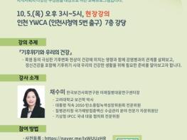 인천연구원 인천탄소중립연구·지원센터는 2023년 10월 5일 오후 3시, 인천YWCA 7층 강당에서 “기후위기와 우리의 건강”이라는 주제로 '제41차 인천녹색기후아카데미'를 개최한다.