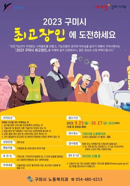 구미시는 27일까지 관내 산업현장에 종사하는 숙련기술자들이 긍지와 자부심을 가지고 산업발전과 지역경제 활성화에 기여할 수 있도록 '2023년 구미시 최고장인' 대상자를 접수한다.