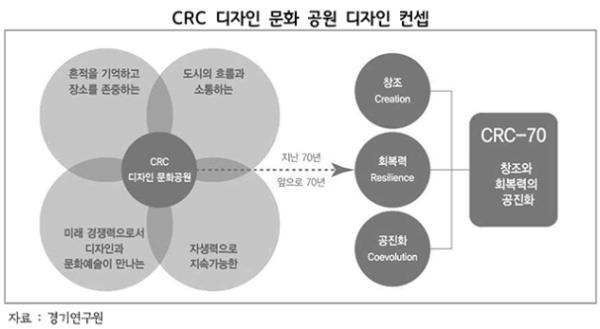 이에 연구원은 근현대 역사적 가치를 보유하고 있는 캠프 레드클라우드(CRC)의 장소적 특성을 재발견하고 공간 특성에 의해 축적된 경험의 가치를 콘텐츠로 활용하고자 ▲흔적을 기억하고 장소를 존중하는 캠프 레드클라우드(CRC) 디자인 문화 공원 ▲도시의 흐름과 소통하는 캠프 레드클라우드(CRC) 디자인 문화 공원 ▲미래에 경쟁력을 갖추기 위한 역량으로서 디자인과 문화예술이 만나는 캠프 레드클라우드(CRC) 디자인 문화 공원 ▲자생력으로 지속가능한 캠프 레드클라우드(CRC) 디자인 문화 공원의 4가지 기본구상과 함께 캠프 레드클라우드(CRC) 공간 특성을 고려한 6개 구역별(스포츠, 지역관광, 미래에너지, 디자인, 상업, 지역산업) 클러스터 조성 방안을 제시했다. 향후 70년 창조(Creation)와 회복력(Resilience)의 공진화(Coeveolution)를 이루는 디자인 문화 공원을 상징하는 개념인 ‘변화로 미래를 창조하는 CRC-70’을 도출, ‘CRC-70’의 브랜드화도 제시했다.