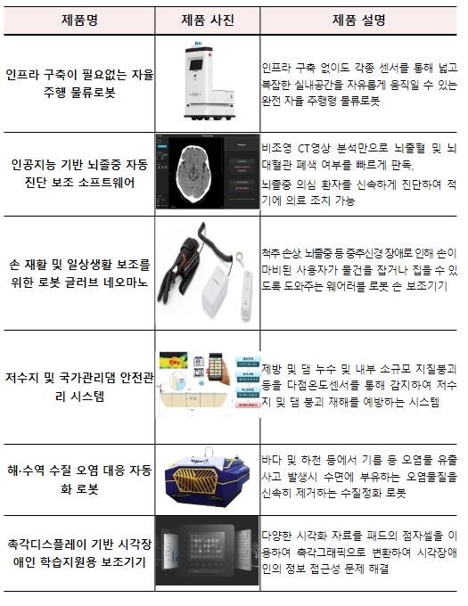 인프라 구축이 없어도 물류현장에 바로 도입 가능한 ‘자율주행 물류로봇’은 스마트 물류 전환에 기여할 것으로 기대하며, ‘인공지능 기반 뇌졸중 진단 소프트웨어’는 뇌졸중 응급환자 상태를 신속하게 감별하여 치료 골든타임을 확보하는 데 큰 역할을 할 것이다.