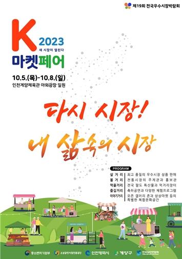 국내 최대 전통시장 축제인 제19회 전국우수시장박람회 ‘2023 K-마켓페어’가 오는 10월 5일부터 8일까지 4일간 인천 계양체육관 야외광장 일원에서 개최된다.