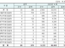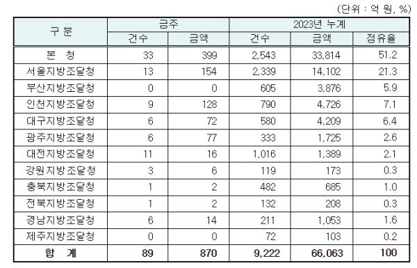 지역별 발주량을 보면 대전광역시 소재 본청 399억 원, 서울지방청 154억 원 등 2개청(553억 원)이 전체 금액(870억 원)의 63.6%를 차지하고 있으며, 인천 등 나머지 10개 지방청 317억 원이 각각 집행될 예정이다.