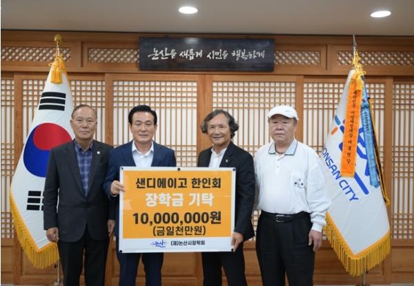 추석 연휴 전에는 미국 샌디에이고 한인회에서 마련한 정성이 논산시로 전해지기도 했다. 백황기 샌디에이고 한인회장을 비롯한 한인회원들은 지난 9월 27일 논산시청을 방문해 장학금 1천만 원을 기증했다. 대건중학교를 나온 것으로 알려진 백 회장은 “교민들이 모은 사랑과 나눔의 정신을 논산시 미래에 보태고자 한다”며 소중한 장학금을 건넸다.
