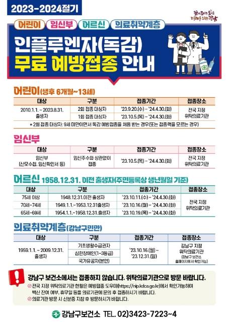 꿈이 모이는 도시, 미래를 그리는 강남구가 다가오는 겨울철 인플루엔자 유행에 대비해 어린이, 임산부, 어르신, 기초생활수급자 등 15만 1655명을 대상으로 무로 예방접종을 실시한다.