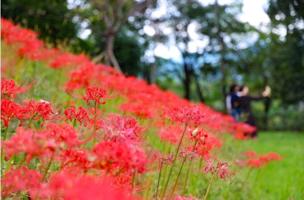 6일 산청군 산엔청공원에 진홍빛 꽃무릇이 만개해 초가을 풍경을 자아내고 있다.
