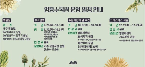 11일에는 두 수목원 모두 휴원한다. 일월수목원은 제60회 수원화성문화제 국제 우호 도시의 날 행사로 인해 7일 휴원할 예정이다.