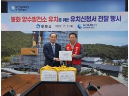 봉화군은 5일 박현국 군수, 김희문 양수발전소 유치위원장, 소천면 두음리, 남회룡리 주민 등 30여 명이 유치 염원을 담은 서명부와 유치신청서를 제출하기 위해 한국중부발전본사에 방문했다.