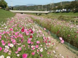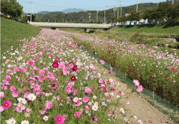 임실천 1.1km 산책로 구간에 코스모스를 파종하고 제초, 시비 작업 등을 하며 관리하고 있다.