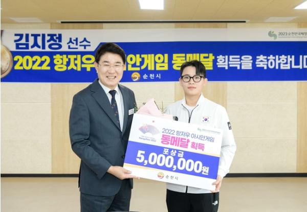 순천시체육회장, 순천시체육회?순천시유도회 관계자 등 20여 명이 모인 가운데 김지정 선수와 순천시청 유도팀 김양호 감독에게 꽃다발과 포상금을 전달하며 축하와 응원을 아끼지 않았다.