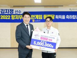노관규 순천시장이 지난 5일 올림픽기념국민생활관에서 제19회 항저우 아시안게임 유도 여자 ?63kg급에서 동메달을 획득한 순천시청 유도팀 김지정 선수를 격려했다.