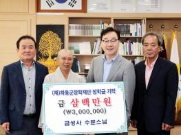 (재)하동군장학재단은 진교면 금성사 수문 주지스님이 지난 5일 군수 집무실을 찾아 지역의 후학 양성에 써달라며 장학기금 300만원을 기탁했다고 6일 밝혔다.