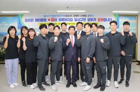 대구광역시 달서구 직장운동경기부 소속 실업팀(검도부, 장애인 수영팀) 선수단이 6일 전국체전과 전국장애인체전 및 중국 항저우에서 개최되는 아시안페러게임에 출전하기에 앞서 출정식을 개최하고, 선전을 다짐했다.