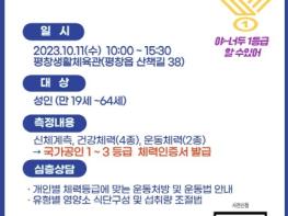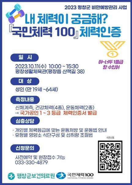 평창군보건의료원은 10월 11일부터 12일까지 평창생활체육관에서 성인 120명을 대상으로 비만예방관리를 위한 『국민체력 100』 체력인증 서비스를 제공한다고 밝혔다.